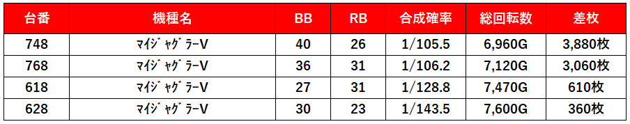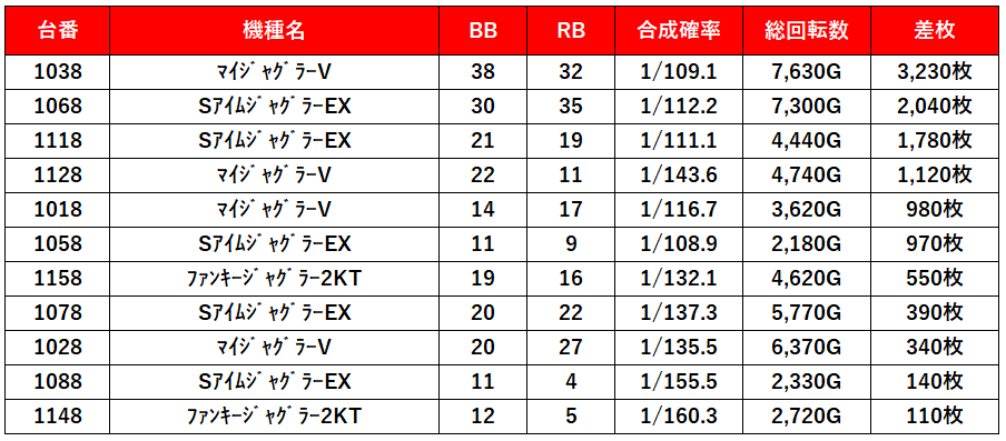 4台あるマイジャグVが全部プラスで2台が3,000枚超え!