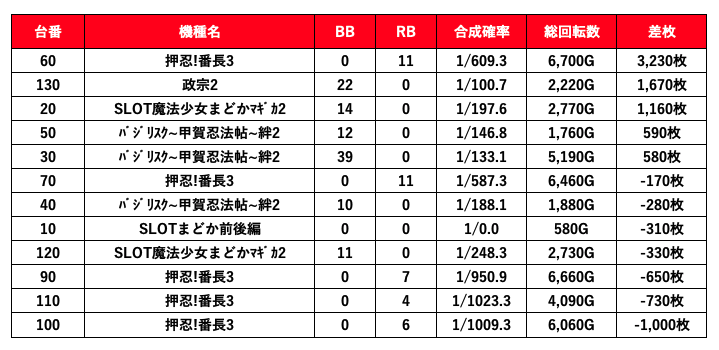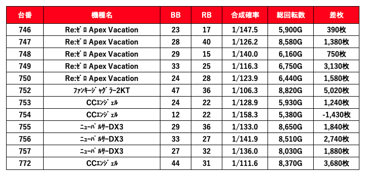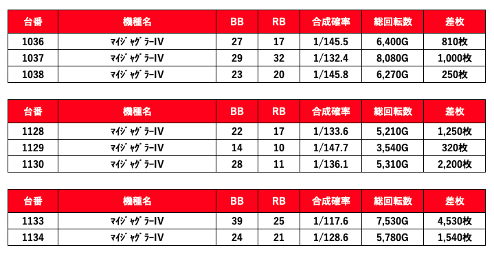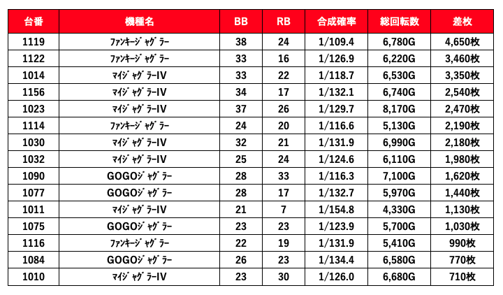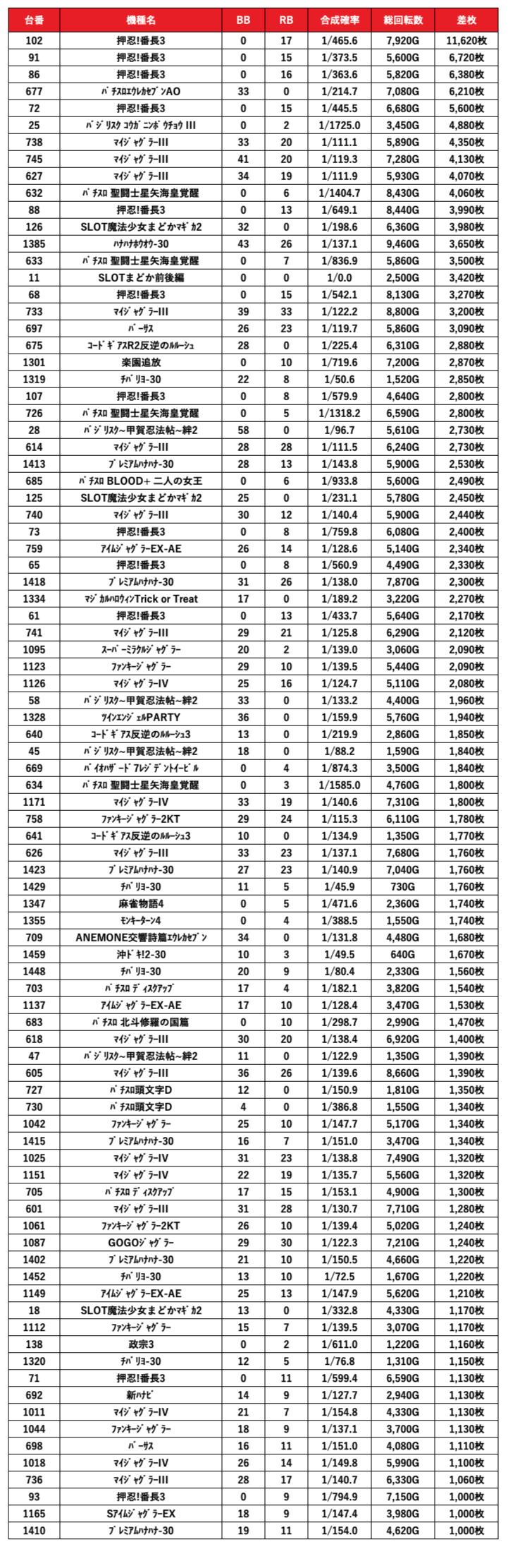 差枚1000枚以上の単品は約90台と今回も多いね。