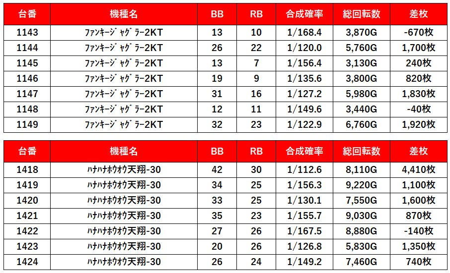 比較的設置台数が多い機種に仕込んできてるから全台系とまではいかないけど7~14台の並びでこの勝率は優秀!