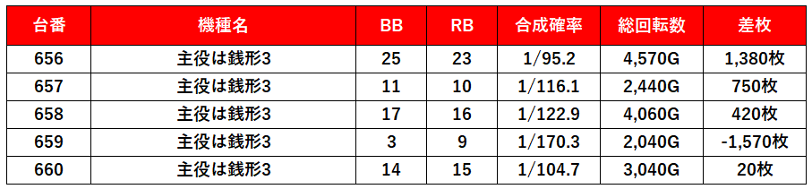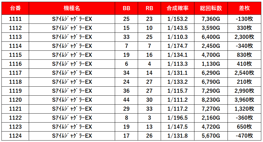 比較的設置台数が多い機種に仕込んできてるから全台系とまではいかないけど7~14台の並びでこの勝率は優秀!